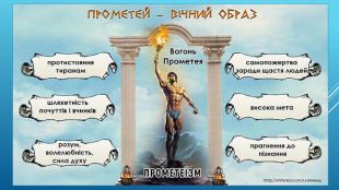 У грецькій міфології титанами називають божества старшого покоління, а в переносному значенні — людей виняткового розуму й таланту. Прометей допоміг Зевсові здобути владу над світом. Під час суперечки про зменшення жертв богам Прометей став на бік людей, які потерпали від голоду й були безсилі проти могутніх олімпійців. Розгніваний Зевс забрав у людей вогонь. Однак Прометей викрав його з Олімпу й приніс людям у тростинці (це відгомін прадавнього способу видобування вогню тертям шматків дерева). Так людський рід було врятовано від голоду й холоду. За нескореність Зевс звелів покарати Прометея жорстоким способом. Але Прометей був непохитним і став символом незламності духу.