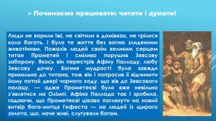 Починаємо працювати: читати і думати!Люди не варили їжі, не світили в домівках, не грілися коло багать, і було те життя без вогню злиденним животінням. Пожалів людей своїм великим серцем титан Прометей і сміливо порушив Зевсову заборону. Якось він перестрів Афіну Палладу, любу Зевсову дочку. Богиня мудрості була завжди прихильна до титана, тож він і попросив її відчинити йому потай двері чорного ходу, що вів до Зевсового палацу, — адже Прометеєві було вже невільно з’являтися на Олімпі. Афіна Паллада так і зробила, гадаючи, що Прометеєві цікаво поглянути на новий витвір бога-митця Гефеста — на людей із щирого золота, що, наче живі, слугували богам.