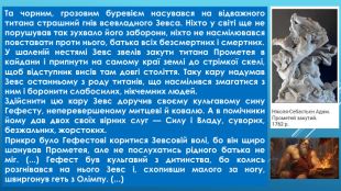 Та чорним, грозовим буревієм насувався на відважного титана страшний гнів всевладного Зевса. Ніхто у світі ще не порушував так зухвало його заборони, ніхто не насмілювався повставати проти нього, батька всіх безсмертних і смертних. У шаленій нестямі Зевс звелів закути титана Прометея в кайдани і припнути на самому краї землі до стрімкої скелі, щоб відступник висів там довгі століття. Таку кару надумав Зевс останньому з роду титанів, що насмілився змагатися з ним і боронити слабосилих, нікчемних людей. Здійснити цю кару Зевс доручив своєму кульгавому сину Гефесту, неперевершеному митцеві й ковалю. А в помічники йому дав двох своїх вірних слуг — Силу і Владу, суворих, безжальних, жорстоких. Прикро було Гефестові коритися Зевсовій волі, бо він щиро шанував Прометея, але не послухатись рідного батька не міг. (...) Гефест був кульгавий з дитинства, бо колись розгнівався на нього Зевс і, схопивши малого за ногу, швиргонув геть з Олімпу. (...)