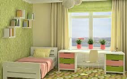 A. There is a shelf under the bed. B. There are books on the shelf. C. There is a lamp near the window. D. There are toys in the room. |