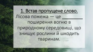 1. Встав пропущене слово. Лісова пожежа — це ________ поширення вогню в природному середовищі, що знищує рослини й шкодить тваринам.