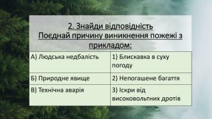 2. Знайди відповідність. Поєднай причину виникнення пожежі з прикладом:{68 D230 F3-CF80-4859-8 CE7-A43 EE81993 B5}А) Людська недбалість1) Блискавка в суху погоду. Б) Природне явище2) Непогашене багаття. В) Технічна аварія3) Іскри від високовольтних дротів