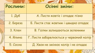 {ED083 AE6-46 FA-4 A59-8 FB0-9 F97 EB10719 F}Рослини: Осінні зміни:1. Дуб. А. Листя жовтіє і опадає пізно2. Береза. Б. Листя стає жовтим і швидко опадає3. Клен. В. Голки залишаються зеленими4. Ялина. Г. Листя забарвлюється у червоний колір5. Сосна. Д. Хвоя не змінює колір і не опадає