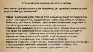 3. Урок жіночої самодостатності та вибору. Хоча роман був написаний у ХІХ столітті, він пропонує такий погляд на роль жінки у суспільстві: Право на власний шлях: Ровена була вимушена слідувати традиційному шляху - стати дружиною, продовжити рід (навіть якщо обирала коханого). Ребекка ж, залишивши Айвенго, обрала самостійний шлях служіння та допомоги нужденним, ставши незалежною від чоловіка. Актуальність сьогодні: Це вчить сучасних дівчат і юнаків тому, що жінка має право на самовизначення, на кар'єру, на життя поза шлюбом чи традиційною роллю. Справжня сила полягає у здатності самостійно визначати свою долю та робити вибір, який відповідає власним моральним переконанням, а не очікуванням суспільства. Особиста мужність: Історія Ребекки, її протистояння Бріану де Буагільберу, є прикладом психологічної стійкості та особистої мужності, які є необхідними для подолання життєвих труднощів сьогодні.