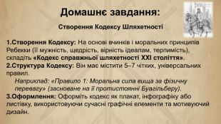 Домашнє завдання: Створення Кодексу ШляхетностіСтворення Кодексу: На основі вчинків і моральних принципів Ребекки (її мужність, щедрість, вірність ідеалам, терпимість), складіть «Кодекс справжньої шляхетності XXI століття». Структура Кодексу: Він має містити 5–7 чітких, універсальних правил. Наприклад: «Правило 1: Моральна сила вища за фізичну перевагу» (засноване на її протистоянні Буагільберу). Оформлення: Оформіть кодекс як плакат, інфографіку або листівку, використовуючи сучасні графічні елементи та мотивуючий дизайн.