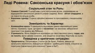 Критерій. Леді Ровена (Саксонка)Ребекка (Єврейка)Життєва позиція. Пасивна: Очікує на захист і порятунок від чоловіків (Айвенго, Чорний Лицар). Активна: Діє самостійно (лікування, моральний опір). Роль у сюжетіПриз для героя; символ саксонської гордості. Рушійна сила; моральний орієнтир для читача. Джерело сили. Соціальний статус та заступництво (Седрік, Айвенго). Внутрішня гідність, знання і віра. Авторська оцінка. Традиційний, ідеалізований образ жінки. Складна, реалістична та глибока героїня.