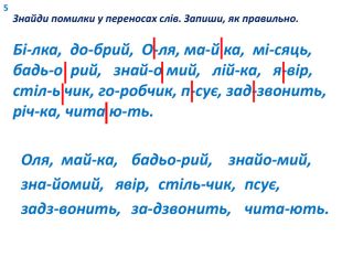 5 Знайди помилки у переносах слів. Запиши, як правильно. Бі-лка, до-брий, О-ля, ма-й ка, мі-сяць, бадь-о рий, знай-о мий, лій-ка, я-вір, стіл-ь чик, го-робчик, п-сує, зад-звонить, річ-ка, чита ю-ть. Оля, май-ка, бадьо-рий, знайо-мий, явір, стіль-чик, псує, задз-вонить, за-дзвонить, чита-ють.зна-йомий,