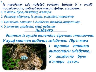 Тема: Змістовний зв’язок між частинами тексту Мета: поглибити знання учнів про структурні одиниці тексту; формувати уявлення про змістовний зв’язок між частинами тексту; розвивати зв’язне мовлення; виховувати бережливе ставлення до природи.